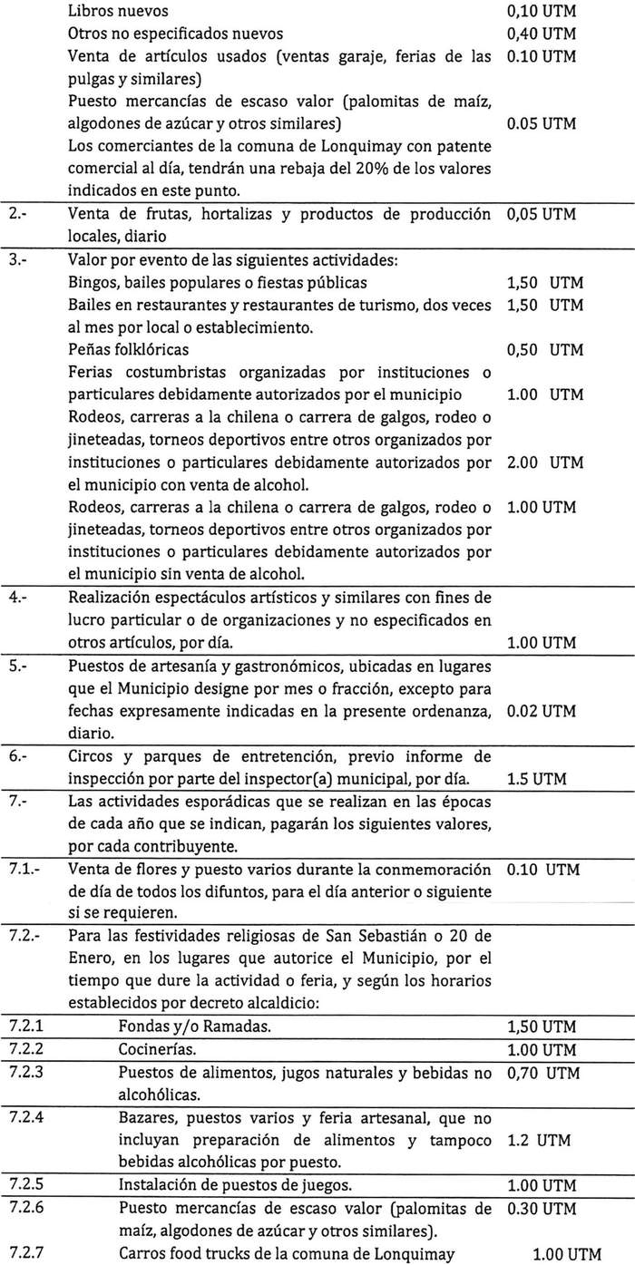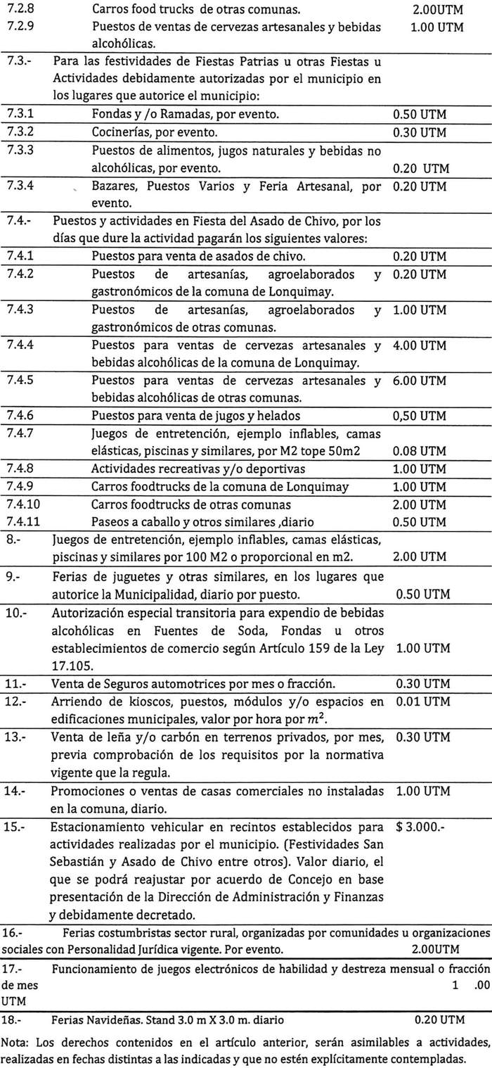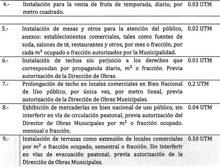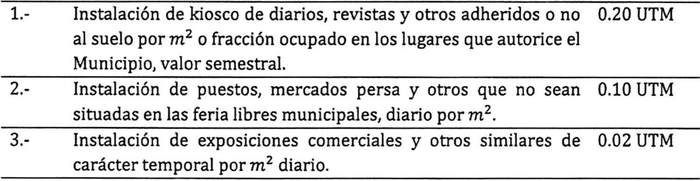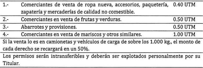Artículo 12: El otorgamiento de permisos para el ejercicio transitorio de actividades lucrativas pagará los siguientes derechos municipales, y previa autorización del Alcalde, si así se estima, para casos puntuales: