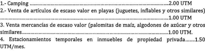 Artículo 13: El otorgamiento de permisos para el ejercicio transitorio de actividades lucrativas en temporada estival (entendiéndose los meses de diciembre, enero y febrero) pagará los siguientes derechos municipales, previa autorización de la autoridad sanitaria si correspondiere, si así se estima, para casos puntuales: