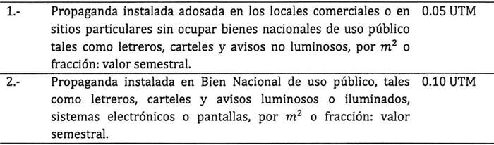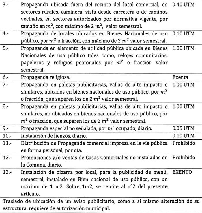Artículo 18: Toda la propaganda que se realice en la vía pública o que sea vista desde la misma, estará afecta a pago de los derechos contemplados en la Ley de Rentas Municipales y en la presente ordenanzas, y sus valores serán los siguientes:
