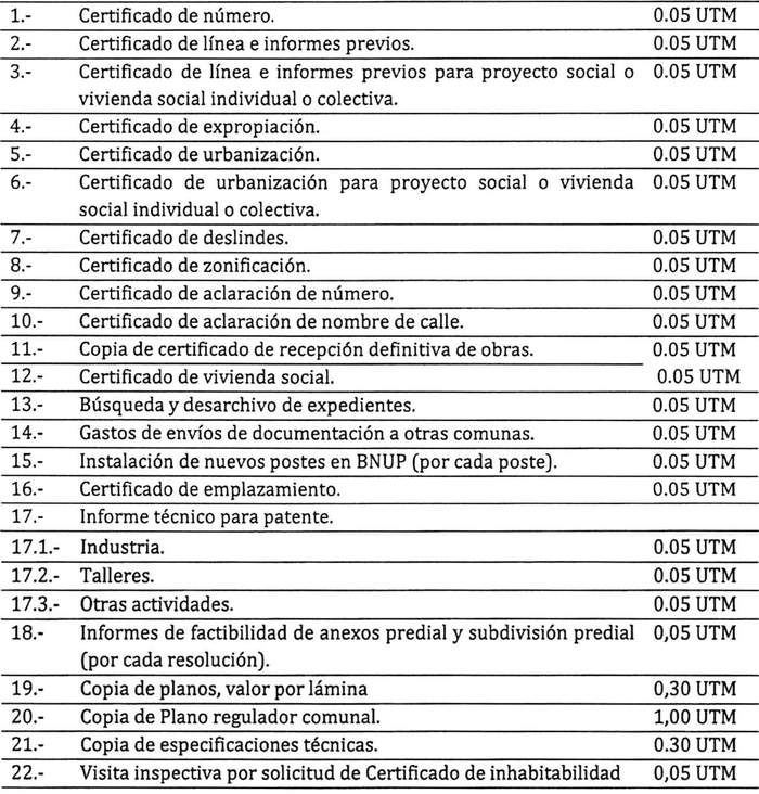 Artículo 24: Los servicios, concesiones o permisos relativos a la urbanización y construcción que se señalan más adelante, pagarán los derechos municipales que se indica, en conformidad a lo dispuesto en el Art. 130 de la Ley General de Urbanismo y Construcciones, contenidas en el Decreto Supremo 458 del Ministerio de Vivienda y Urbanismo, publicado en el Diario Oficial del 13.04.76 y sus modificaciones.