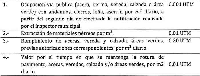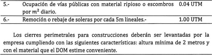 Artículo 26: Los servicios, concesiones y permisos de Bienes Nacionales de Uso Público, relativo a la urbanización y construcción, pagaran los siguientes derechos municipales.