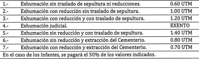 Artículo 30: Los derechos por exhumación de cuerpos serán los siguientes: