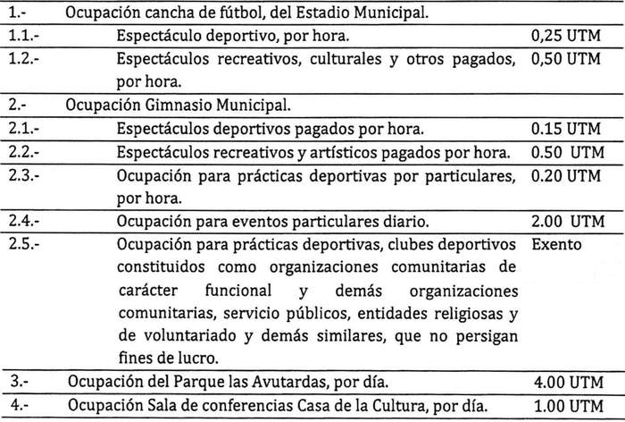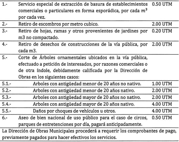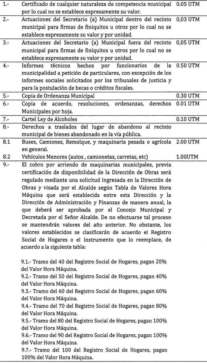Artículo 38: Los valores por las distintas concesiones, permisos y/o servicios y las multas que se indican en la presente ordenanza podrán ser reajustados anualmente con aprobación del Concejo Municipal, y vigente a contar del decreto que lo apruebe. El mismo procedimiento se utilizará para incluir cobros no contemplados, rebajar o eliminar los que se determinen.