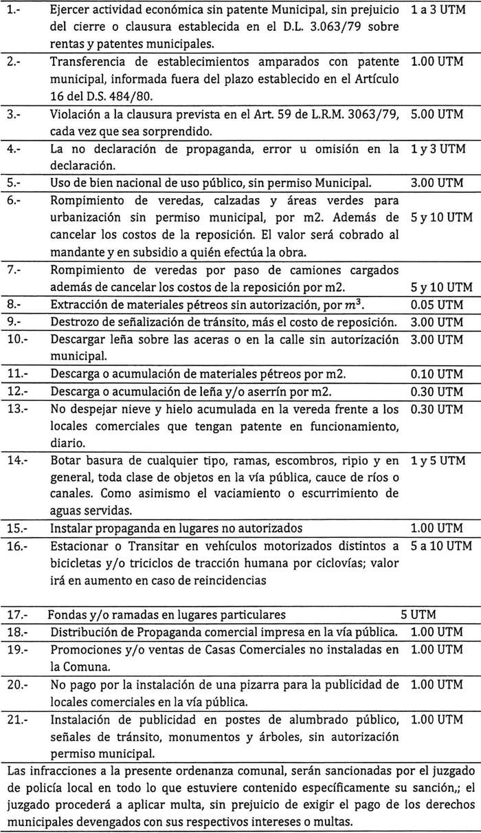Artículo 67: Las infracciones a la presente ordenanza que no tengan establecida una sanción especial serán sancionadas con una multa desde 0,5 hasta 5 UTM, atendiendo la gravedad, permanencia del hecho y el haber o no reincidencia.