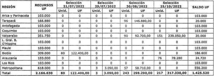 7. Los recursos comprometidos para los proyectos seleccionados en el concurso que se llamó por resolución exenta N° 855 (V. y U.), de 2022, y sus modificaciones, cuyos cierres de postulación se efectuaron los días 21 de julio, 29 de julio, 30 de agosto y 25 de octubre, se resumen en el siguiente cuadro para cada región del país, incluyendo la suma total de Unidades de Fomento comprometidas en la presente resolución:
