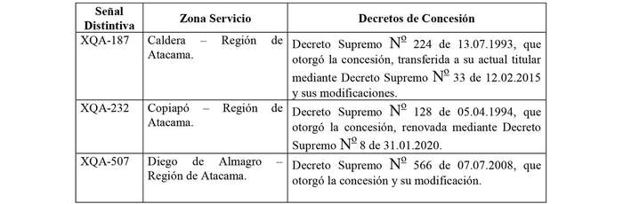 1. Modifícanse las concesiones de radiodifusión sonora en frecuencia modulada, cuyo titular es la sociedad Comercial Los Incas Limitada, RUT N° 78.320.420-7, según consta en los decretos supremos indicados en la letra f) de los Vistos, en el sentido que su nuevo titular es la Sociedad Festiva Limitada, RUT N° 76.427.324-9, con domicilio en Colipí N° 371, comuna de Copiapó, Región de Atacama, las concesiones que a continuación se señalan.