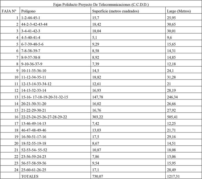 1.1 Un poliducto, que contiene 4 ductos de 110 milímetros que se encuentran en forma soterrada en 24 fajas de terreno de ancho 0,6 mts. y de distintos largos, que forman parte de la urbanización que pasa por las calles Mar Tirreno y Avenida Luis Cousiño, comuna de Peñalolén, Región Metropolitana de Santiago, cuyas fajas se indican en la tabla siguiente: