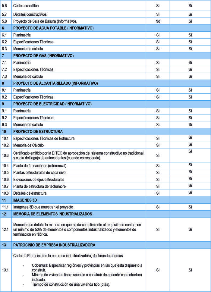 . Asimismo, las propuestas deberán incorporar como mínimo un 50% de elementos o componentes industrializados como muros y losas (o entrepisos), debiendo a la vez integrar elementos de terminación y especialidades (sanitaria y eléctrica) desarrolladas en fábrica. Para casos específicos, la DITEC podrá autorizar condiciones distintas a las anteriormente señaladas.
