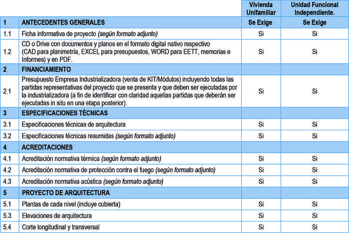 1. Deberá preparar el expediente de ingreso incorporando todos los documentos técnicos, jurídicos, sociales y administrativos que le son exigibles por el decreto y el llamado respectivo. Junto con eso, se deben incorporar en el expediente todos los antecedentes que den cuenta de la aprobación del Proyecto de Vivienda Industrializada Tipo en la Ditec (oficio aprobatorio, planimetría, especificaciones técnicas, memorias, entre otros). Estos proyectos estarán exentos de presentar Permiso de Edificación en atención a lo establecido en la Glosa N° 6 de la Ley de Presupuestos para el Sector Público.