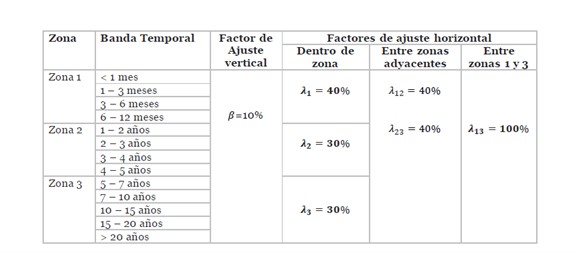 . Tanto los PRM por moneda y banda temporal, como los factores de ajuste vertical y horizontales, se determinan de acuerdo con las siguientes tablas: