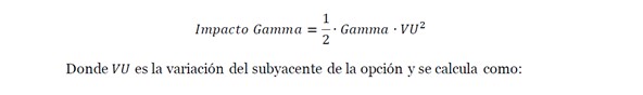Adicional a lo anterior, el banco debe calcular el cargo por riesgo gamma. Para cada opción individual, incluyendo la posición cubierta, se calcula el impacto gamma, de acuerdo con la siguiente ecuación: