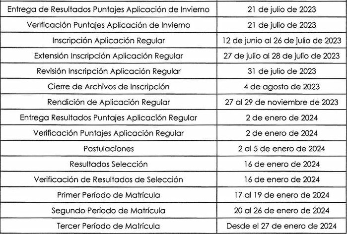 Artículo único: Establézcase el calendario de los períodos de inscripción, rendición, cierre de archivos y entrega de resultados de la prueba de admisión universitaria de postulación centralizada, resultados de selección y de matrícula, todo correspondiente al proceso de admisión 2024, según se indica a continuación: