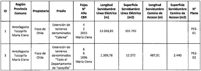 Artículo 7º.- Constitúyase, de acuerdo con lo que sobre el particular establece la Ley General de Servicios Eléctricos, las servidumbres para el establecimiento del proyecto "Línea Eléctrica 1x23 kV Caliche Solar - Encuentro" en los predios que se indican a continuación: