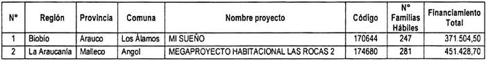 2. Apruébase la siguiente nómina de proyectos seleccionados, con su respectivo financiamiento total, para el otorgamiento de subsidios del Programa Habitacional Fondo Solidario de Elección de Vivienda en la alternativa de postulación colectiva, para proyectos de Construcción en Nuevos Terrenos, en la comuna de Los Álamos en la provincia de Arauco, de la Región del Biobío y en la comuna de Angol, en la Provincia de Malleco, de la Región de la Araucanía, correspondiente al proceso de selección cuyo cierre de postulación se verificó el día 27 de diciembre de 2022, del llamado efectuado por resolución exenta N° 1.007 (V. y U.), de 2022: