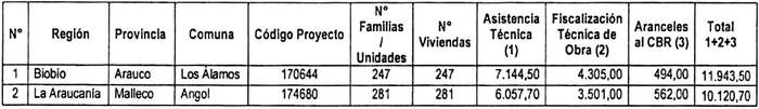 3. El monto del subsidio asignado de conformidad con el cuadro del Resuelvo 2. de esta resolución comprende los siguientes valores por concepto de Servicios de Asistencia Técnica, de Labores de Fiscalización Técnica de Obra y pago de Aranceles al Conservador de Bienes Raíces:
