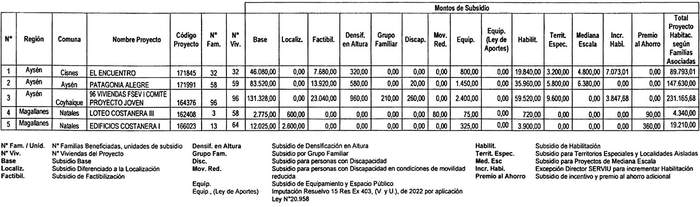 2. Apruébase la nómina de proyectos seleccionados, con su respectivo financiamiento total, para el otorgamiento de subsidios del Programa Habitacional Fondo Solidario de Elección de Vivienda en la alternativa de postulación colectiva, para proyectos de Construcción en Nuevos Terrenos, en las regiones de Aysén del General Carlos Ibáñez del Campo y de Magallanes y de la Antártica Chilena, correspondiente al proceso de selección cuyo cierre de postulación se verificó el día 27 de diciembre de 2022, del llamado efectuado por la resolución exenta Nº 403 (V. y U.), de 2022: