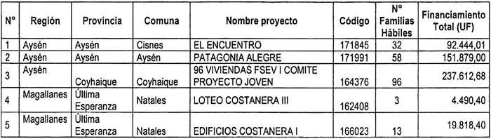 2. Apruébase la nómina de proyectos seleccionados, con su respectivo financiamiento total, para el otorgamiento de subsidios del Programa Habitacional Fondo Solidario de Elección de Vivienda en la alternativa de postulación colectiva, para proyectos de Construcción en Nuevos Terrenos, en las regiones de Aysén del General Carlos Ibáñez del Campo y de Magallanes y de la Antártica Chilena, correspondiente al proceso de selección cuyo cierre de postulación se verificó el día 27 de diciembre de 2022, del llamado efectuado por la resolución exenta Nº 403 (V. y U.), de 2022: