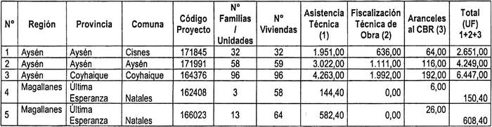 3. El monto del subsidio asignado de conformidad con el cuadro señalado en el Resuelvo 2. de esta resolución comprende los siguientes valores, en Unidades de Fomento, por concepto de Servicios de Asistencia Técnica, de Labores de Fiscalización Técnica de Obra y pago de Aranceles al Conservador de Bienes Raíces: