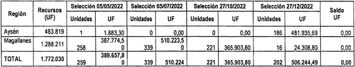 4. Los recursos comprometidos en el resuelvo 2. de la presente resolución, para los proyectos seleccionados en el llamado realizado mediante la resolución exenta Nº 403 (V. y U.), de 2022, cuyo cierre de postulación se efectuó el día 27 de diciembre de 2022, se señalan en el siguiente cuadro, incluyendo la suma total de familias beneficiadas y las Unidades de Fomento comprometidas, considerando los montos de subsidio de los proyectos, incluidos sus respectivos servicios de asistencia técnica y fiscalización técnica de obras para cada región del país: