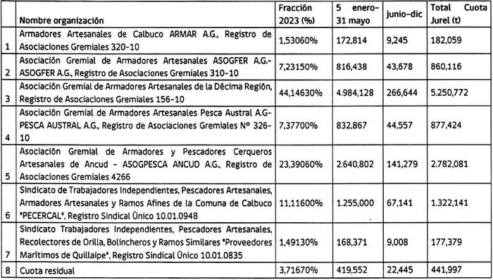 Por Resolución N° 316, de 6 de febrero de 2023, de esta Subsecretaría, rectifíquese el resuelvo 1º de la resolución exenta Nº 2.865, de 2022, de esta Subsecretaría, que estableció la distribución de la fracción artesanal de la cuota global anual de captura de Anchoveta, Sardina común y Jurel, correspondiente a la Región de Los Lagos, sometida al Régimen Artesanal de Extracción por organizaciones de pescadores artesanales, en el sentido de cambiar la tabla ahí indicada, de la pesquería artesanal Jurel por la siguiente: