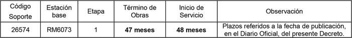 1. Autorízase a la concesionaria para modificar los plazos de término de obras e inicio de servicios de una (1) Estación Base, autorizada por decreto exento Nº 621 de 2019, según se indica a continuación: