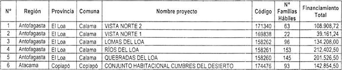 2. Apruébase la siguiente nómina de proyectos seleccionados, con su respectivo financiamiento total, para el otorgamiento de subsidios del Programa Habitacional Fondo Solidario de Elección de Vivienda en la alternativa de postulación colectiva, para los proyectos de Construcción en Nuevos Terrenos, en las regiones de Antofagasta y Atacama correspondiente al proceso de selección cuyo cierre de postulación se verificó el día 27 de diciembre de 2022, del llamado efectuado por resolución exenta Nº 1.038 (V. y U.), de 2022: