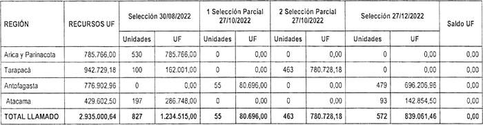 4. Los recursos comprometidos en el resuelvo 2. de la presente resolución, para los proyectos seleccionados en el cierre de postulación efectuado el día 27 de diciembre de 2022, del concurso a que se llamó por resolución exenta Nº 1.038 (V. y U.), de 2022, se resumen en el siguiente cuadro para las regiones del país que indica, incluyendo la suma total de familias beneficiadas y las Unidades de Fomento comprometidas, considerando los montos de subsidio de los proyectos, incluidos sus respectivos servicios de asistencia técnica y fiscalización técnica de obras: