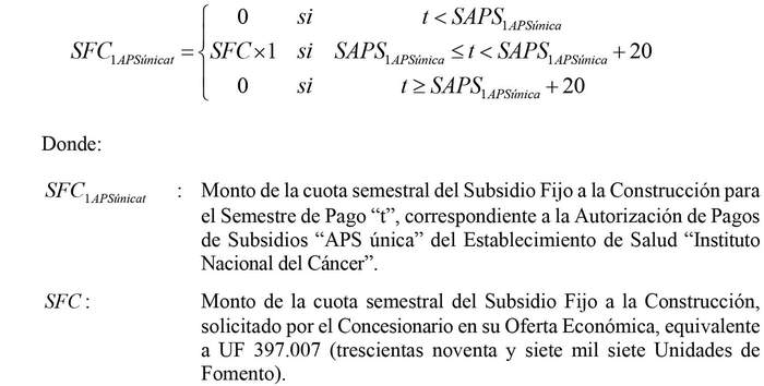 . El Ministerio de Salud, de acuerdo a lo indicado en el artículo 1.12.2.1 de las Bases de Licitación, pagará semestralmente al Concesionario, para el Establecimiento de Salud "Instituto Nacional del Cáncer", 20 (veinte) cuotas correspondientes al Subsidio Fijo a la Construcción. El valor de las cuotas se determinará de acuerdo a la siguiente expresión: