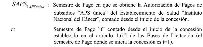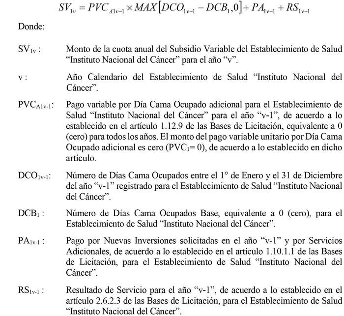 . El Ministerio de Salud, de acuerdo a lo señalado en el artículo 1.12.2.3 de las Bases de Licitación, pagará anualmente al Concesionario, para el Establecimiento de Salud "Instituto Nacional del Cáncer", cuotas anuales vencidas correspondientes al Subsidio Variable, de acuerdo a la siguiente expresión: