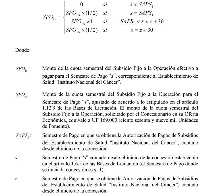 . El Ministerio de Salud, de acuerdo a lo indicado en el artículo 1.12.2.2 de las Bases de Licitación, pagará semestralmente al Concesionario, para el Establecimiento de Salud "Instituto Nacional del Cáncer", cuotas anticipadas correspondientes al Subsidio Fijo a la Operación, que se determinarán de acuerdo a la siguiente expresión: