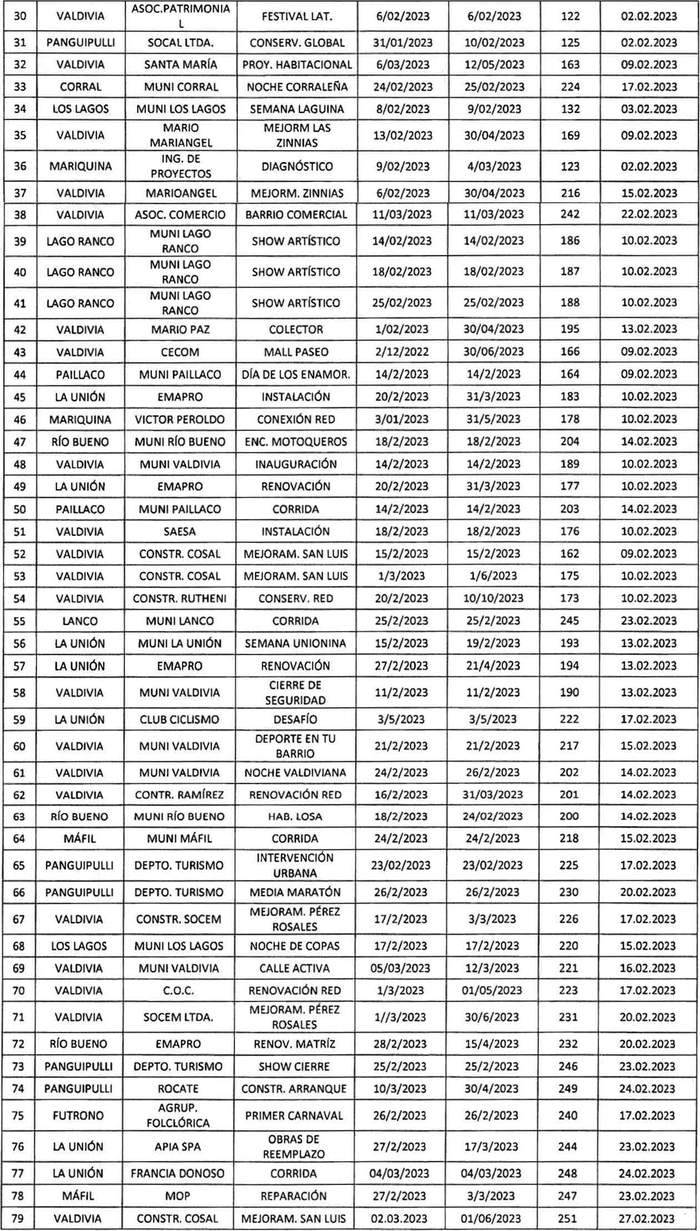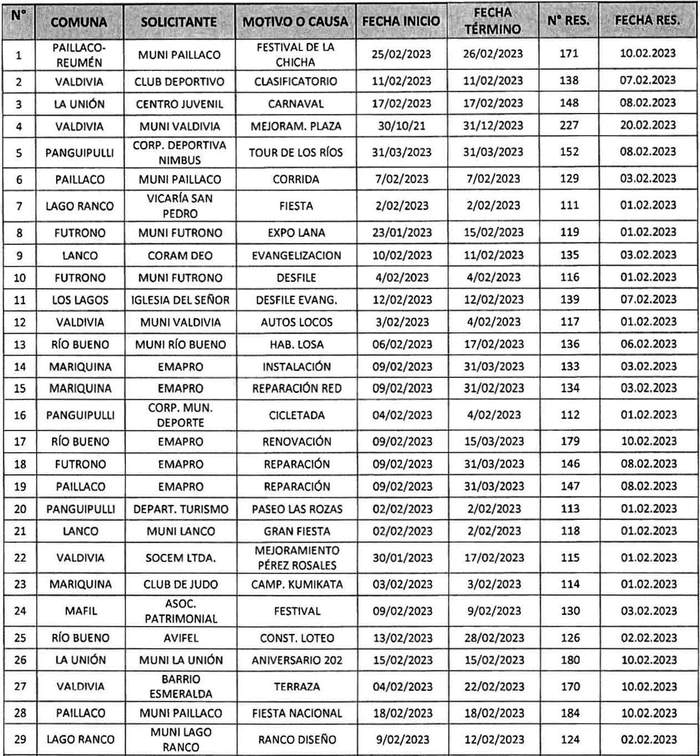 De acuerdo con el formato y lo instruido por el Ministerio de Transportes y Telecomunicaciones, el Gobierno Regional de Los Ríos publica las resoluciones exentas mes febrero año 2023, Nos. 171, 138, 148, 227, 152, 129, 111, 119, 135, 116, 139, 117, 136, 133, 134, 112, 179, 146, 147, 113, 118, 115, 114, 130, 126, 180, 170, 184, 124, 122, 125, 163, 224, 132, 169, 123, 216, 242, 186, 187, 188, 195, 166, 164, 183, 178, 204, 189, 177, 203, 176, 162, 175, 173, 245, 193, 194, 190, 222, 217, 202, 201, 200, 218, 225, 230, 226, 220, 221, 223, 231, 232, 246, 249, 240, 244, 248, 247, 251, en las fechas descritas, prohibió la circulación de vehículos por las vías que se indican y por los motivos que se señalan en el siguiente cuadro: