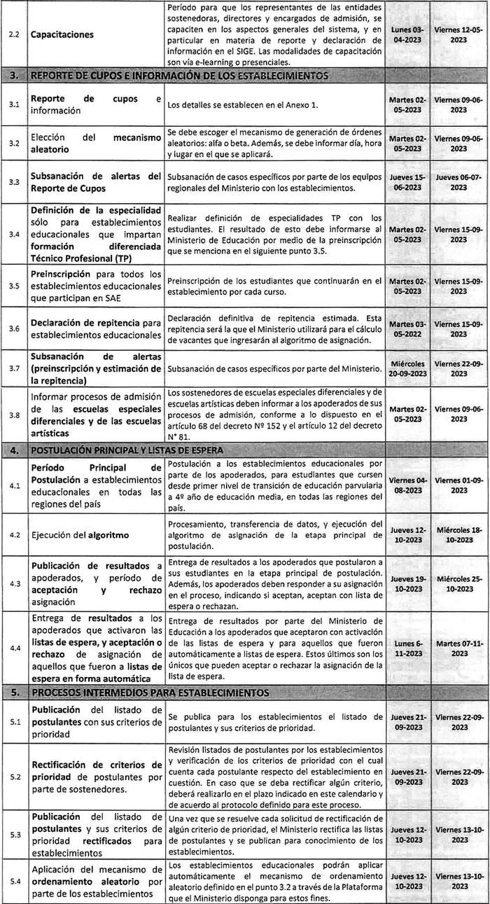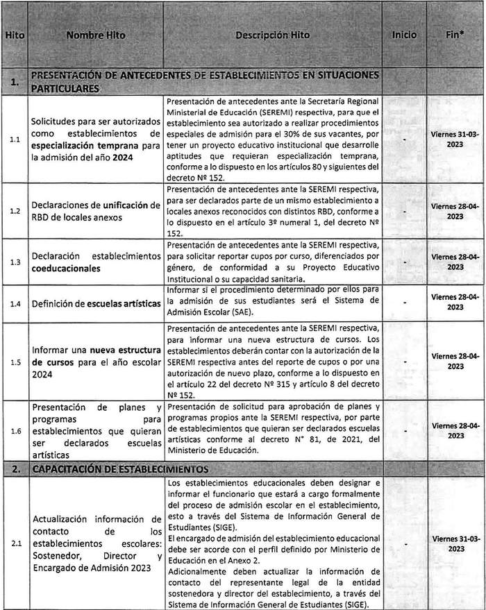 Artículo primero: Apruébase el siguiente calendario de admisión escolar para la postulación del año 2023 y admisión del año 2024, de establecimientos que reciben subvención o aportes del Estado de todas las regiones del país, según los hitos, fechas y períodos que comprende y que a continuación se detallan:
