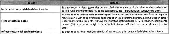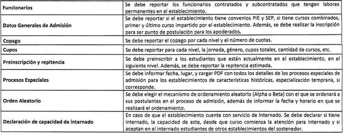 - Tener conocimiento y acceso a información general del establecimiento, la cual deberá ser ingresada por el encargado de Admisión en SIGE (por ejemplo: cupos totales de cada nivel, capacidad máxima del establecimiento, proyecto educativo, copago, reglamento interno, georreferenciación de la ubicación del establecimiento, entre otros).