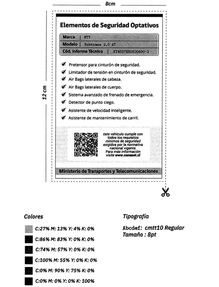 El rótulo contendrá un listado de todos los elementos de seguridad optativos definidos en el artículo 2º del decreto supremo Nº 26/2000, indicándose con una marca de verificación (✓) los elementos con que cuenta el vehículo, entendiéndose que no está provisto de aquellos que no tienen esa marca de verificación y deberá ser concordante con el certificado a que se refiere el inciso primero del mencionado artículo 8º.