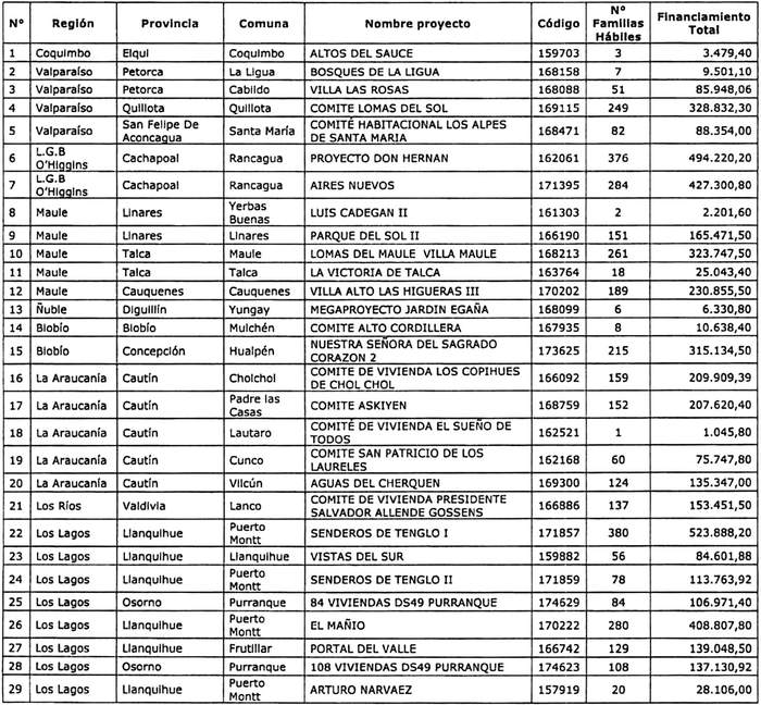 2. Apruébase la siguiente nómina de proyectos seleccionados, con su respectivo financiamiento total, para el otorgamiento de subsidios del Programa Habitacional Fondo Solidario de Elección de Vivienda en la alternativa de postulación colectiva, para proyectos de Construcción en Nuevos Terrenos, en las regiones de Coquimbo, Valparaíso, O'Higgins, Maule, Ñuble, Biobío, La Araucan�a, Los Ríos y Los Lagos, correspondiente al proceso de selección cuyo cierre de postulación se verificó el día 27 de diciembre de 2022, del llamado efectuado por resolución exenta N° 399 (V. y U.), de 2022: