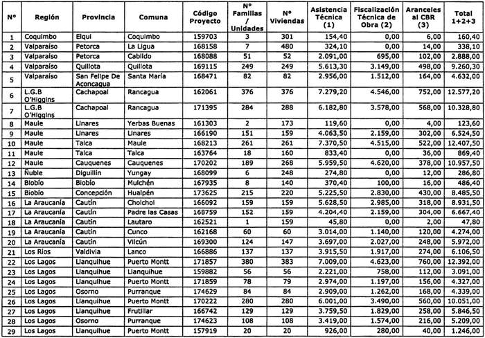 3. El monto del subsidio asignado de conformidad con el cuadro del Resuelvo 2. de esta resolución comprende los siguientes valores por concepto de Servicios de Asistencia Técnica, de Labores de Fiscalización Técnica de Obra y pago de Aranceles al Conservador de Bienes Raíces: