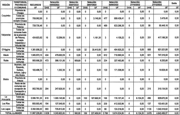 4. Los recursos comprometidos en el Resuelvo 2. de la presente resolución, para los proyectos seleccionados en el cierre de postulación efectuado el día 27 de diciembre de 2022, del concurso a que se llamó por resolución exenta N° 399 (V. y U.), de 2022, se resumen en el siguiente cuadro para cada región del país, incluyendo la suma total de familias beneficiadas y las Unidades de Fomento comprometidas, considerando los montos de subsidio de los proyectos, incluidos sus respectivos servicios de asistencia técnica y fiscalización técnica de obras: