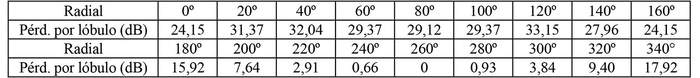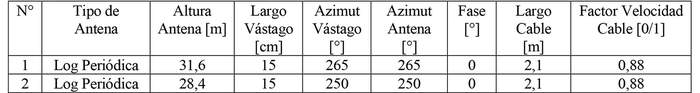 - Arreglo de antenas de acuerdo a la siguiente tabla: