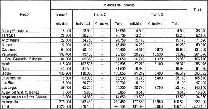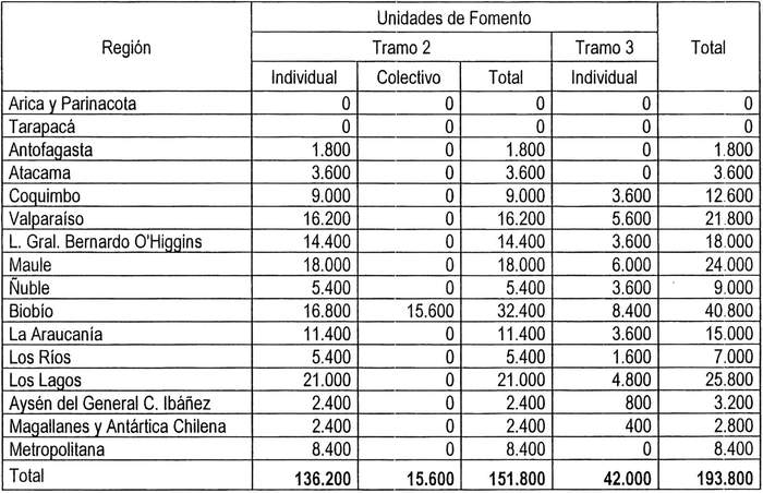 2°.- El monto de Unidades de Fomento (U.F.) que se destinarán al financiamiento del subsidio directo, conforme a las disposiciones del DS N° 1 (V. y U.), de 2011, y su distribución regional por modalidad, tramo y alternativa de postulación, se detalla en los cuadros que se presentan a continuación, pudiendo practicarse redistribuciones que serán sancionadas mediante resolución del Ministro de Vivienda y Urbanismo: