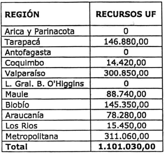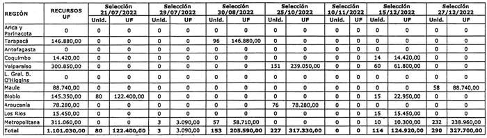 7. Los recursos comprometidos en los resuelvos 2., 3. y 4., de la presente resolución, para los proyectos seleccionados en el concurso que se llamó por resolución exenta Nº 855 (V. y U.), de 2022, y sus modificaciones, cuyos cierres de postulación se efectuaron los días 21 y 29 de julio, 30 de agosto, 25 de octubre, 10 de noviembre y 15 y 27 de diciembre, todos de 2022, se resumen en el siguiente cuadro para cada región del país, incluyendo la suma total de Unidades de Fomento comprometidas en la presente resolución: