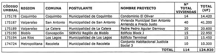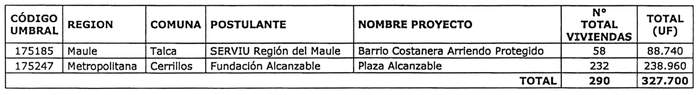 2. Modifícase la resolución exenta Nº 1.655 (V. y U.), de 2022, en el sentido de eliminar del cuadro inserto en el Resuelvo 3, la fila correspondiente al proyecto Código Umbral 173703, Conjunto Habitacional Tranque Forestal y de reemplazar en la fila correspondiente al Total el guarismo "243" por "153" y el guarismo "298.290" por "205.590".