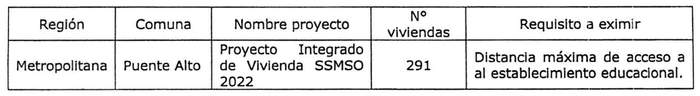 d) Que, por oficio Ord. N° 103 citado en el Visto f), la Secretaria Ministerial Metropolitana de Vivienda y Urbanismo solicita eximir al "Proyecto Integrado de Vivienda SSMSO 2022" presentado en la Región Metropolitana, respecto del cumplimiento de la distancia máxima a un establecimiento educacional, cumpliendo el proyecto con el resto de los requerimientos;