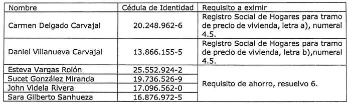 2. Exímanse a las personas que se individualizan a continuación, del "Proyecto Comité de Vivienda Alejandra Olmos", en la Región de Tarapacá, del cumplimiento de las siguientes condiciones y/o requisitos dispuestos en la resolución exenta N° 867 (V. y U.), de 2022: