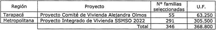 e) Que, por el Memorándum N° 48 citado en el considerando e) y el oficio Ord. N° 29 citado en el Visto f), se da cuenta de la aprobación de los proyectos "Proyecto Comité de Vivienda Alejandra Olmos", en la Región de Tarapacá y "Proyecto Integrado de Vivienda SSMSO 2022", en la Región Metropolitana, que cumplen con los requisitos establecidos en la resolución exenta N° 867 (V. y U.), de 2022, por lo que es posible proceder con la selección de los trabajadores que forman parte de los grupos postulantes asociados a dichos proyectos, los que cumplen con los requisitos y condiciones exigidas para este llamado;