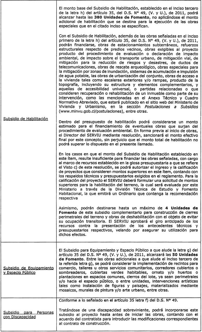 10.1. Para los efectos del presente llamado, los proyectos podrán cumplir con el Cuadro Normativo de Proyectos Habitacionales y Tabla de Espacios de Usos Mínimos para el Mobiliario al que alude el artículo 43 del DS N° 49 (V. y U.), de 2011, aprobado por la Resolución Exenta N° 6.625 (V. y U.), de 2016, y sus modificaciones, o bien, con el Anexo Técnico y Cuadro Normativo Abreviado, que estará publicado en el sitio web del Ministerio de Vivienda y Urbanismo, en la sección Postulaciones a Subsidios (www.minvu.gob.cl/postulaciones), y que se entenderá como parte integrante de esta Resolución.