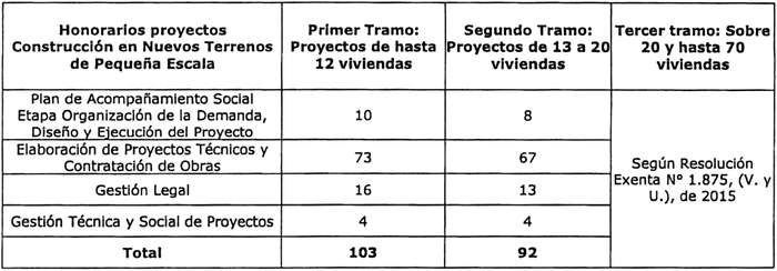 11.2. Los proyectos de hasta 20 familias que postulen al presente llamado, en caso de resultar seleccionados podrán percibir los honorarios por Asistencia Técnica a los que se refiere el numeral 2. del artículo 3°, de la resolución exenta N° 1.875 (V. y U.), de 2015, y se pagarán por familia de acuerdo con lo indicado en el siguiente cuadro: