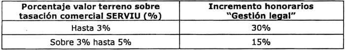 Además, y según corresponda, los honorarios de Asistencia Técnica correspondientes al servicio "Gestión Legal" a que alude la tabla anterior, se incrementarán con un monto adicional, de acuerdo con la relación entre la tasación del terreno y el precio de éste, según el cuadro siguiente: