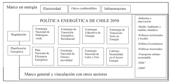Lo dispuesto en el artículo 35 de la Constitución Política de la República; en el Decreto Ley N° 2.224, de 1978, del Ministerio de Minería, que crea el Ministerio de Energía y la Comisión Nacional de Energía; en la Ley N° 21.305, sobre eficiencia energética; en la Ley N° 19.880, que establece bases de los procedimientos administrativos que rigen los actos de los órganos de la Administración del Estado; en la Ley N° 20.500, sobre asociaciones y participación ciudadana en la gestión pública; en la Ley N° 19.300, sobre Bases Generales del Medio Ambiente; en el Oficio N° 348/2021, de 1 de abril de 2021, del Ministerio de Energía; en el Oficio Ordinario N° 190, de 29 de abril de 2021, de la Dirección General de Obras Públicas; en el Oficio Ordinario N° 9673/2021 MTT, de 28 de abril de 2021, del Ministerio de Transportes y Telecomunicaciones; en el Oficio Ordinario N° 10/1288, de 6 de mayo de 2021, de la Subsecretaria de Evaluación Social; en el Oficio Ofic202101277, de 30 de abril de 2021, del Ministerio de Economía, Fomento y Turismo; en el Oficio B32/N° 1614, de 30 de abril de 2021, del Ministerio de Salud; en la Resolución Exenta N° 16, de 5 de abril de 2021, del Ministerio de Energía; en el Acta Sesión Extraordinaria N° 1, del Consejo de Ministros para la Sustentabilidad, de 25 de enero de 2022; en el Acuerdo N° 4, del Consejo de Ministros para la Sustentabilidad, de 25 de enero de 2022; en la Resolución N° 7, de 2019, de la Contraloría General de la República, y
