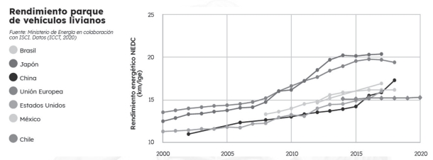 Duplicar el rendimiento de los vehículos livianos nuevos que entran al país al año 2035, respecto del año 2019.