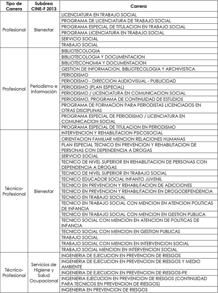 En ese orden de ideas, las Bases Técnicas fijadas en la Resolución Exenta N° 6.255, de 2022, establecen en forma expresa cuáles serán las carreras a regular para el año académico 2024 conforme a la metodología establecida en las referidas Bases. Estas corresponden a cuatro "macrogrupos" de carreras, a saber: carreras Profesionales de las subáreas CINE-F 2013 de "Bienestar" y "Periodismo e Información", y carreras Técnico-Profesionales de las subáreas de "Bienestar" y "Servicios de Higiene y Salud Ocupacional".